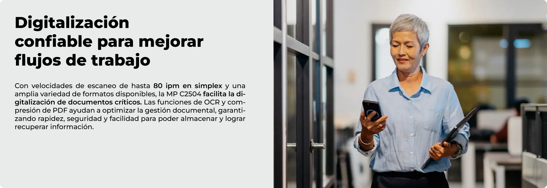 Alimentador automático de documentos reversible (ARDF) | Capacidad original: 100 hojas. Tamaño original: 5,5″ x 8,5″ – 11″ x 17″ (A5-A3). Gramajes del papel: Simple: 11-34 lb Bond (40-128 g/m²), Dúplex: 14-34 lb Bond (52-128 g/m²). |