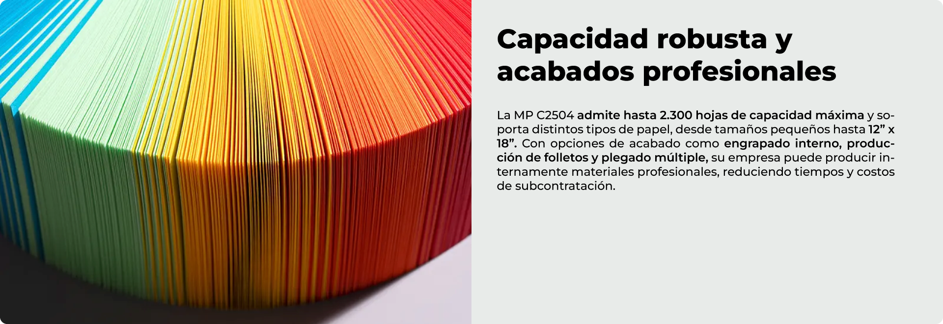Tamaños de papel admitidos | 1.ª bandeja de papel: 8,5″ x 11″ (A4). 2.ª, 3.ª y 4.ª bandejas de papel: 5,5″ x 8,5″ – 12″ x 18″ (A6-A3). Sobres de bypass: hasta 12,6″ x 18″. Sobres de tamaños personalizados: Ancho: 3,5″ – 12,6″ (90 – 320 mm), Largo: 5,8″ – 49,6″ (148 – 1260 mm). |