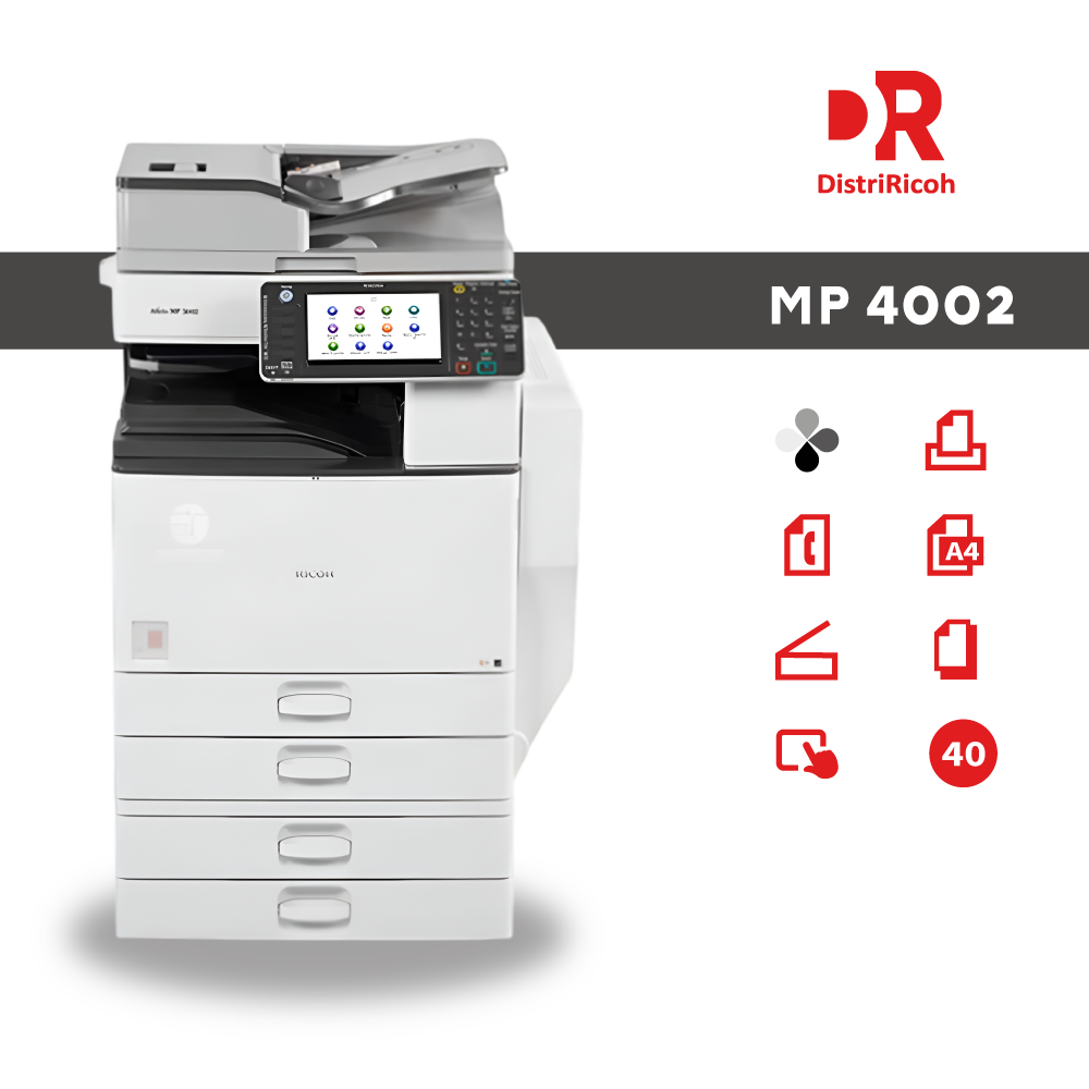 La Ricoh MP 4002 es una fotocopiadora multifuncional en blanco y negro de alto rendimiento, ideal para oficinas, con una velocidad de hasta 40 páginas por minuto y primera copia en 4.1 segundos. Integra funciones de impresión, copiado, escaneo y fax, con dúplex automático, ARDF y pantalla táctil intuitiva. Ofrece resolución de 600 x 600 dpi, capacidad de hasta 1.100 hojas, compatibilidad con tamaños hasta 11″ x 17″ y papel de 218gsm. Diseñada para volúmenes de hasta 200.000 copias mensuales y tóner de 30.000 impresiones, garantiza eficiencia, durabilidad y bajo costo operativo.